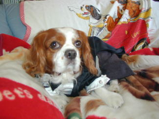 | キングの匂いがしみ込んだキャバ柄の敷物を匂うまりやちゃん・・・ | お洋服を着せられて何だかすね顔のキング |