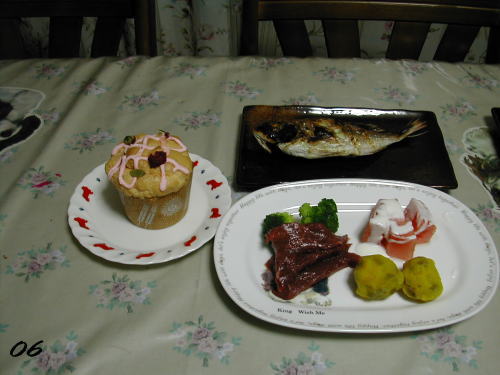 | 鯛、ケーキ、馬刺し、ブロッコリー、サツマイモ、かぼちゃ、スイカ、ヨーグルト | 薔薇は、我家で咲いてる薔薇・・・種類はいろいろ(笑) |